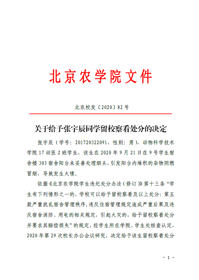 北农校发〔2020〕82号关于给予张宇辰同学留校察看处分的决定